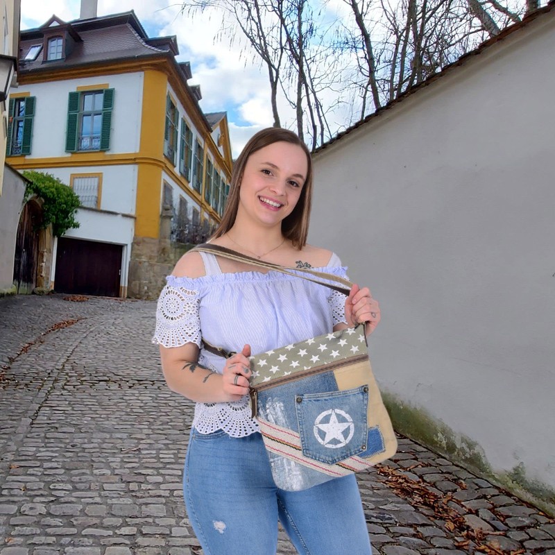 Sunsa Women's Shoulder Bag. Sustainable Bag Made from Recycled Jeans & Canvas. Vintage Style with Star Design Shoulder Bag. Small Crossover Bag, beige