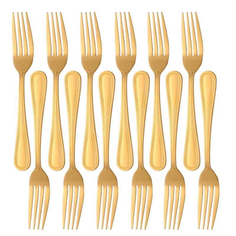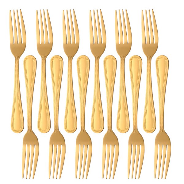 SUNSENGEUR Stainless Steel Kitchen Dinner Forks with Bead Pattern 12-Piece Dinner Fork Set 8.54-inch Stainless Steel Table Forks Classic Flatware Silverware Sets-Gold