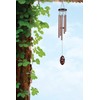 - Bronze colored metal chime rods hang from a dark wood disk