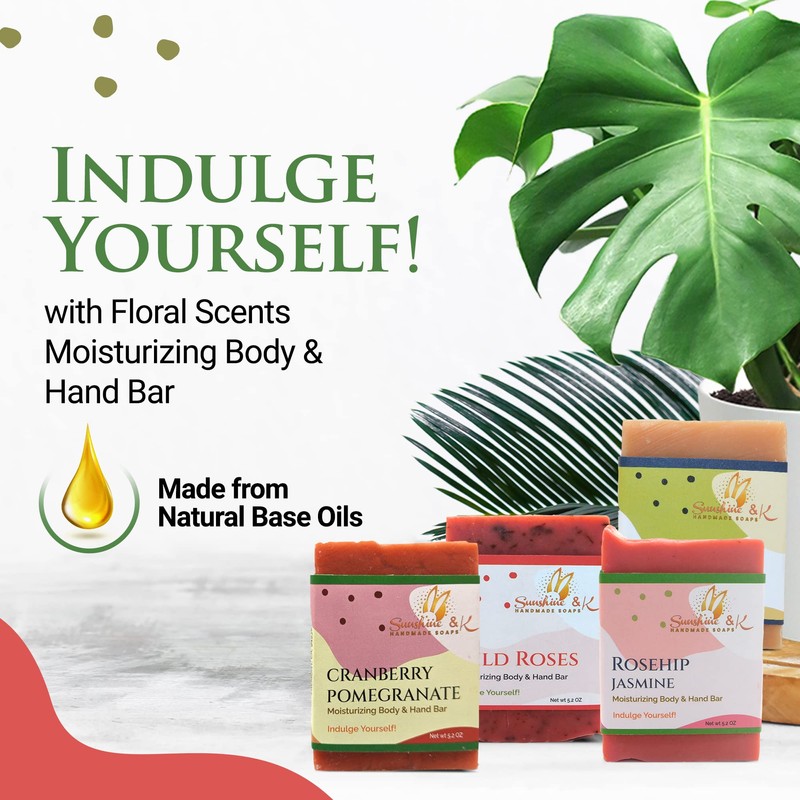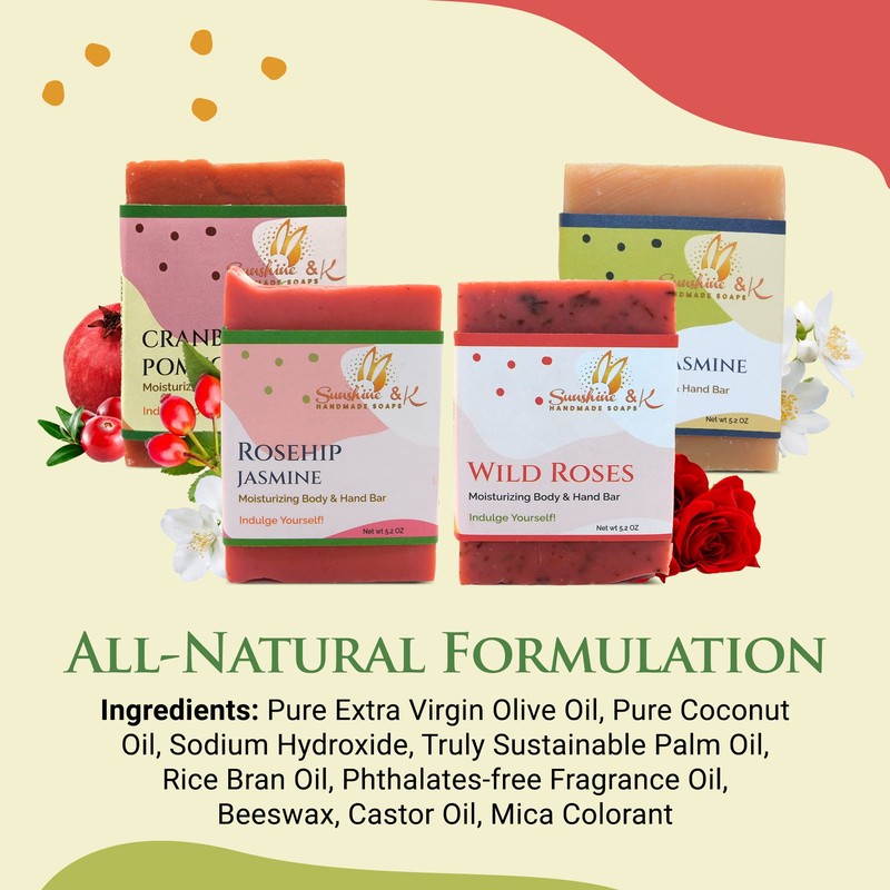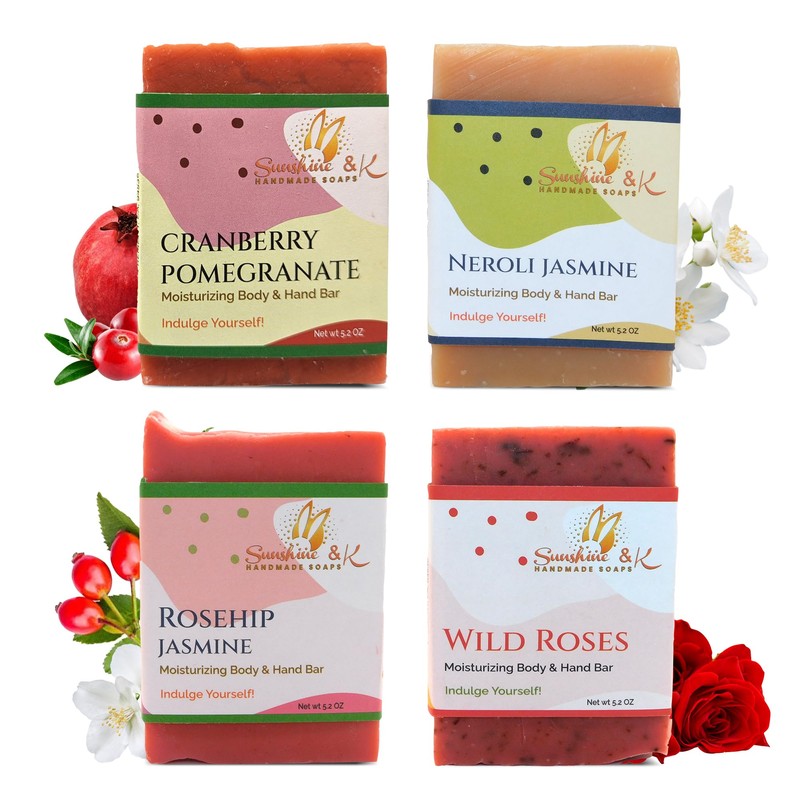 Sunshine & K Handmade Soaps Sunshine & K Handmade Soaps - Body & Hand Soap Bar, Handmade Bath Soap, Moisturizing Bar Soap, Rosehip Jasmine, Neroli Jasmine, Wild Roses, & Cranberry Pomegranate Soap Bars, 20 oz, 4-Scents Set