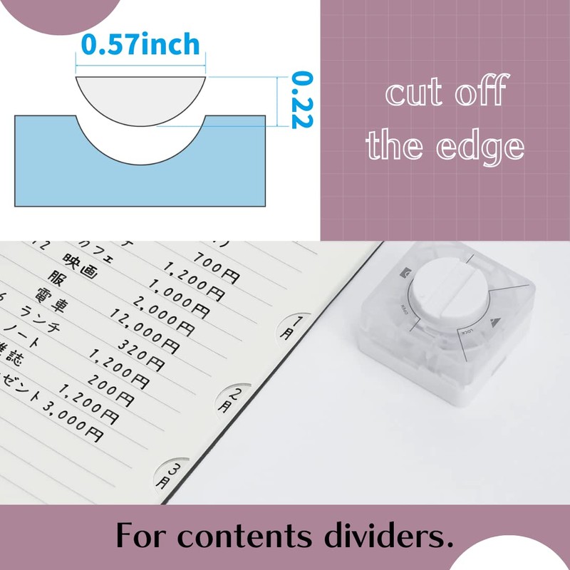 - Cut size: 1/4 circles of cado-cut; 0.3 inch (7.5 mm), half circle of edge cut diameter 0.6 inch (14.4 mm) height 0.2 inch (5.5 mm)