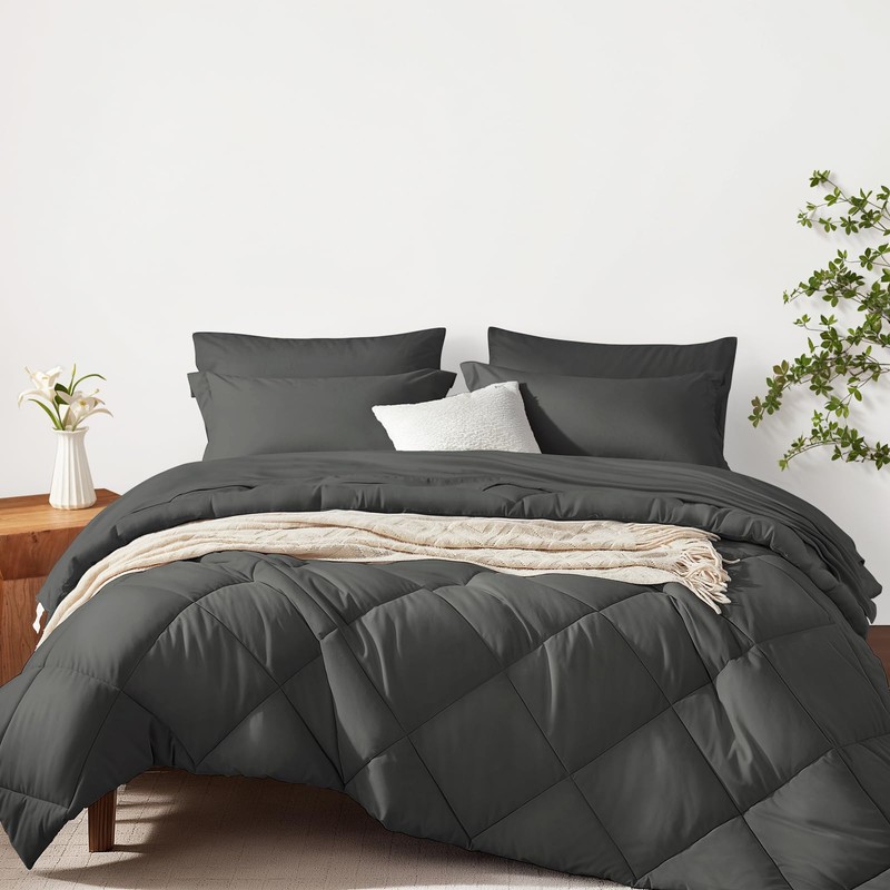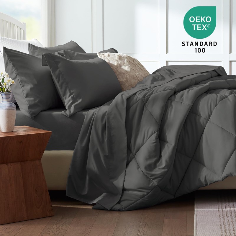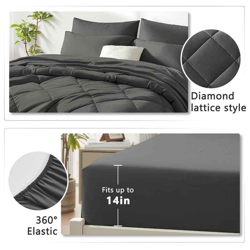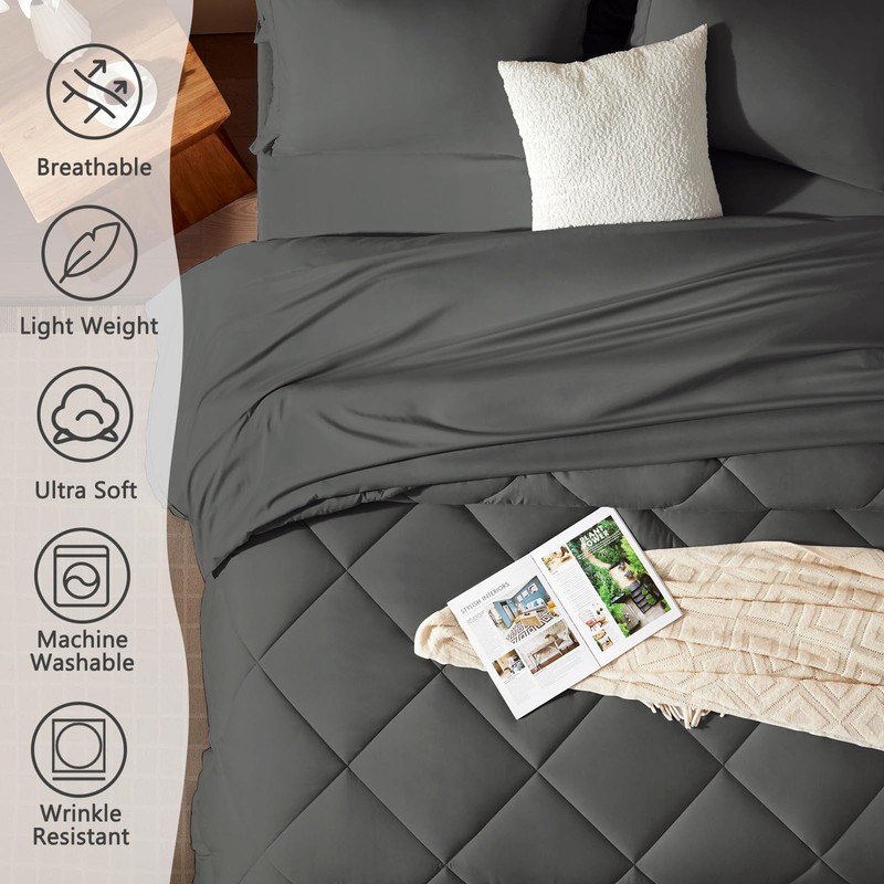 SunStyle Home Full Comforter Sets, 7-Pieces Bed in a Bag with Comforter and Sheets, All Season Bedding Sets with Comforter, Flat Sheet, Fitted Sheet Pillow Shams and Pillowcases (Dark Grey)