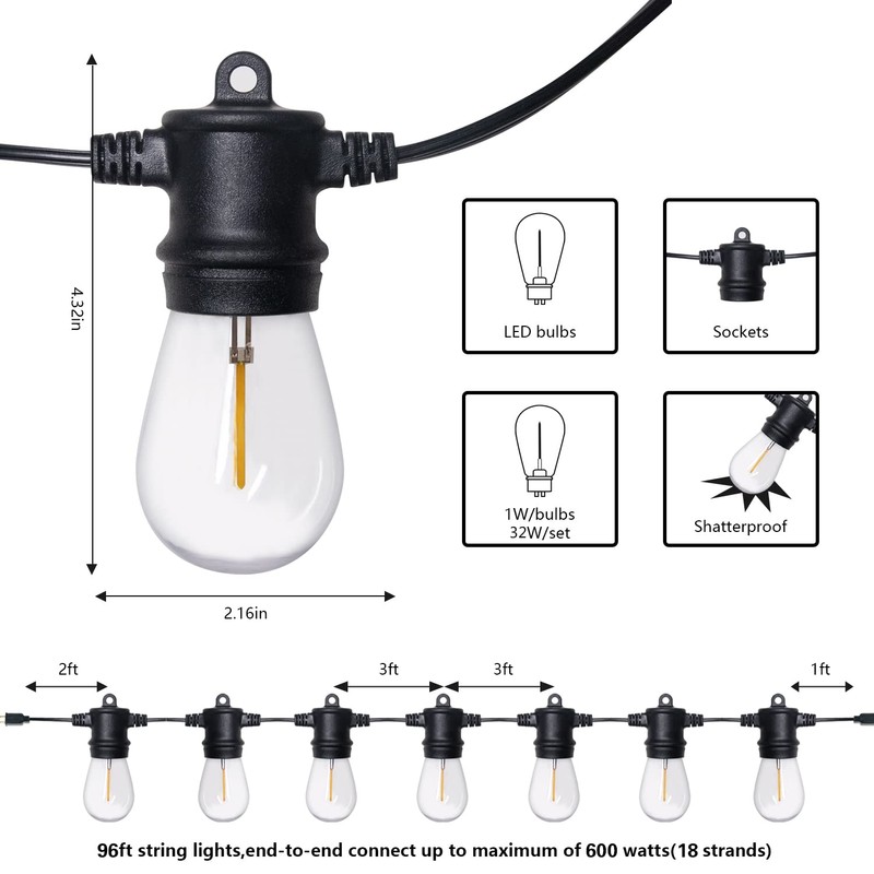 SUNTHIN Outdoor String Lights, 96FT Patio Lights with 32 LED Shatterproof Bulbs, Hanging for Outside, Garden, Backyard, Deck, Porch, Fence, Bistro, Pool, Party