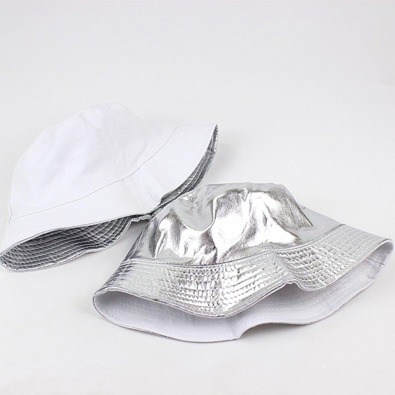 SUNTRADE Metallic Double-Side-Wear Bucket Hat, Trendy Fisherman Hats, Unisex Reversible Packable Sun Cap, white-silver, Unit size