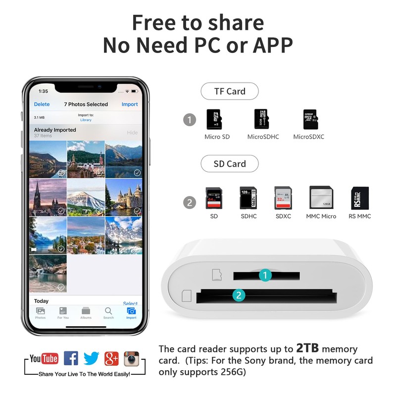 - Capacity and Format Support: The sd card reader support standard photo formats including JPER and RAW,and SD,HD video formats including H.264 and MPEG 4,supports the memory card with a maximum capacity of 2TB.