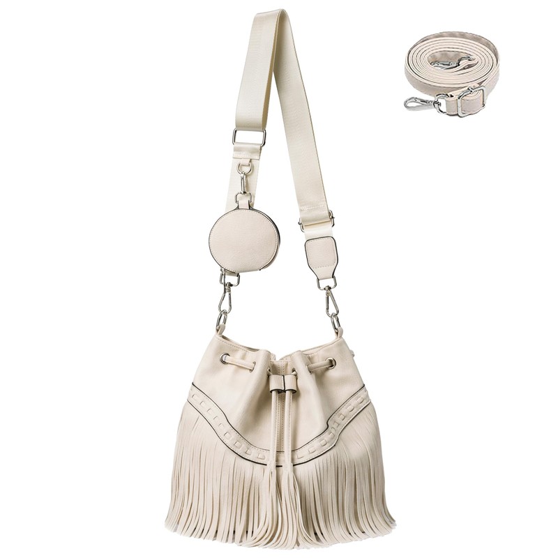 Sunwel Fashion Women Bucket Fringe Hobo Bag Western Purse Vegan Leather Tassel Hippie Shoulder Crossbody Bag, Off-white