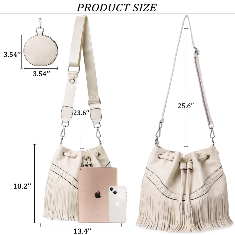 - Medium Size: bucket purse with fringe is W14.17" x H 10.23" ; Strap adjustable range is from 12.99" to 25.98". Longest drop is suitable carry as a crossbody bag. Shorten the strap to swift to a hobo bag.