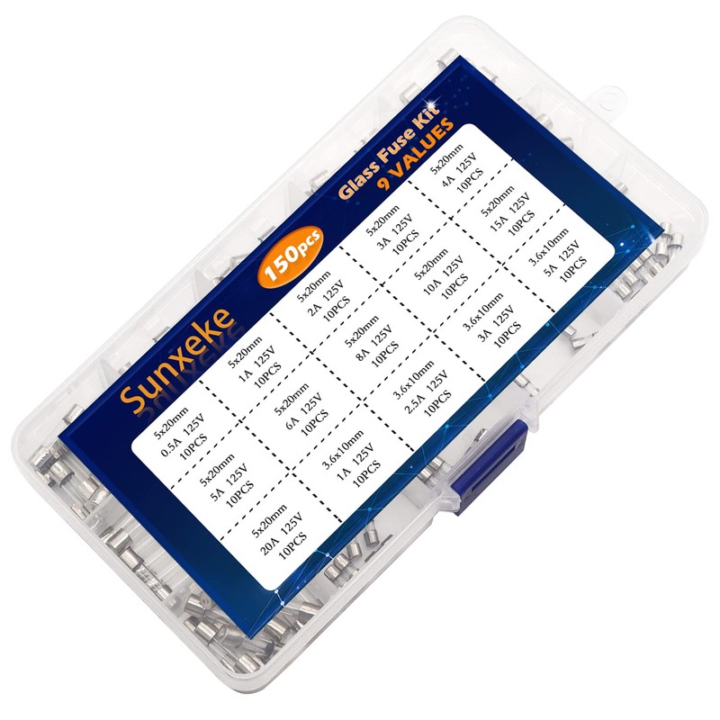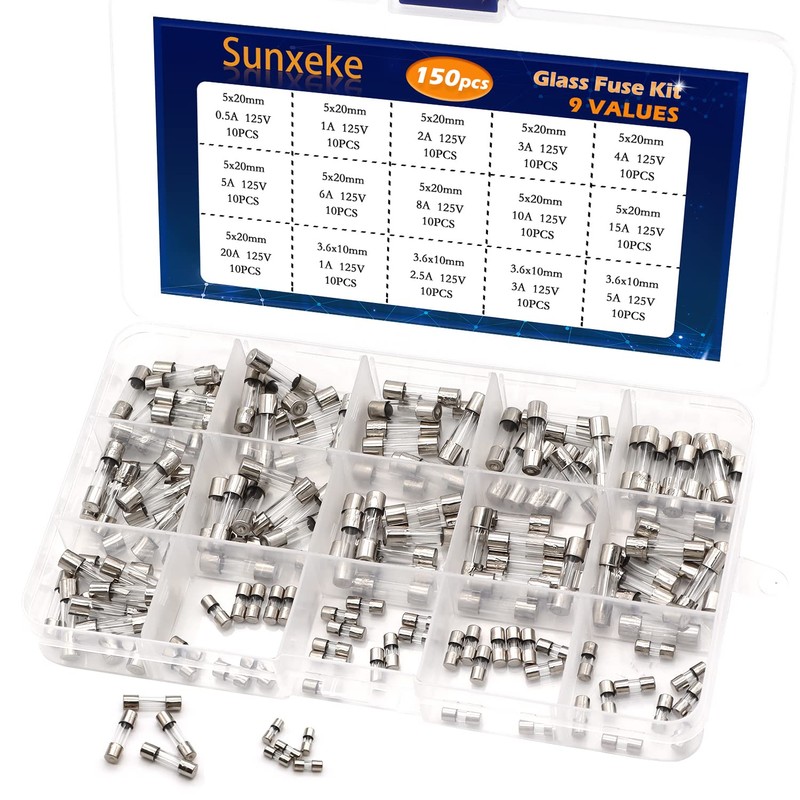 Sunxeke 15 Values 150 Pcs 125V Fast Blow Glass Fuses Assortment Kit 3.6X10MM 1/2.5/3/5 Amp 125V Mini Glass Fuses Replacement