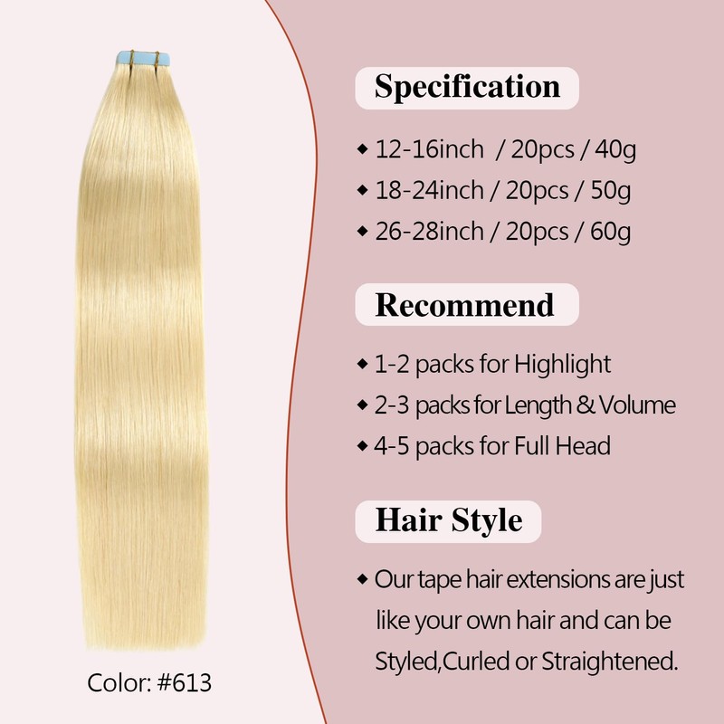 - Advice of Packs: Tape In Human Hair Extension Is A Good Choice If You Wanna Change Your Hair Style Or Add Volume. 12 inch-16 inch,40g/pcs. 18 inch- 24 inch,50g/pcs. 26 inch-28 inch,60g/pcs.If Your Hair Is Thick, 1-2 packs Are Enough To Add Length. 2-3 Packs To Add Volume. If Your Hair Is Thin,1-2 Packs To For Highlight, 2-3 Packs To Add Volue And Length.3-4 Packs For Whole Head Looks.