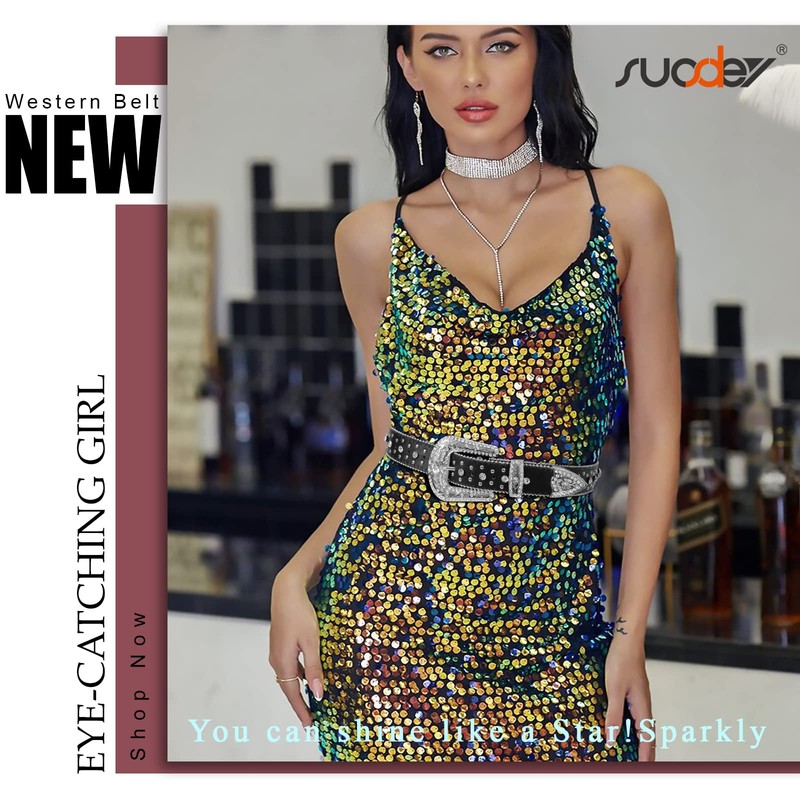 - ♛【Shiny Rhinestone Belt】The SUOSDEY fashion diamond belt is made of high-quality leather, the whole belt is inlaid with shiny diamonds, and the exquisite rivet design is dazzling and exquisite. A must-have accessory for western cowboys and cowgirls.
