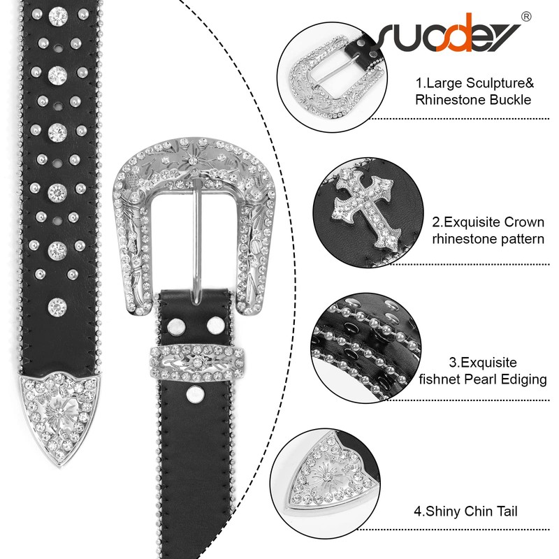 SUOSDEY Rhinestone Belt for Women,Leather Studded Belt for Dress Jeans, Bling Western Cowboy Cowgirl Belt Cross Black