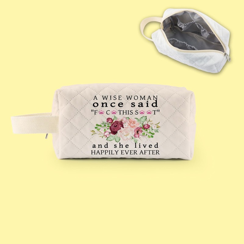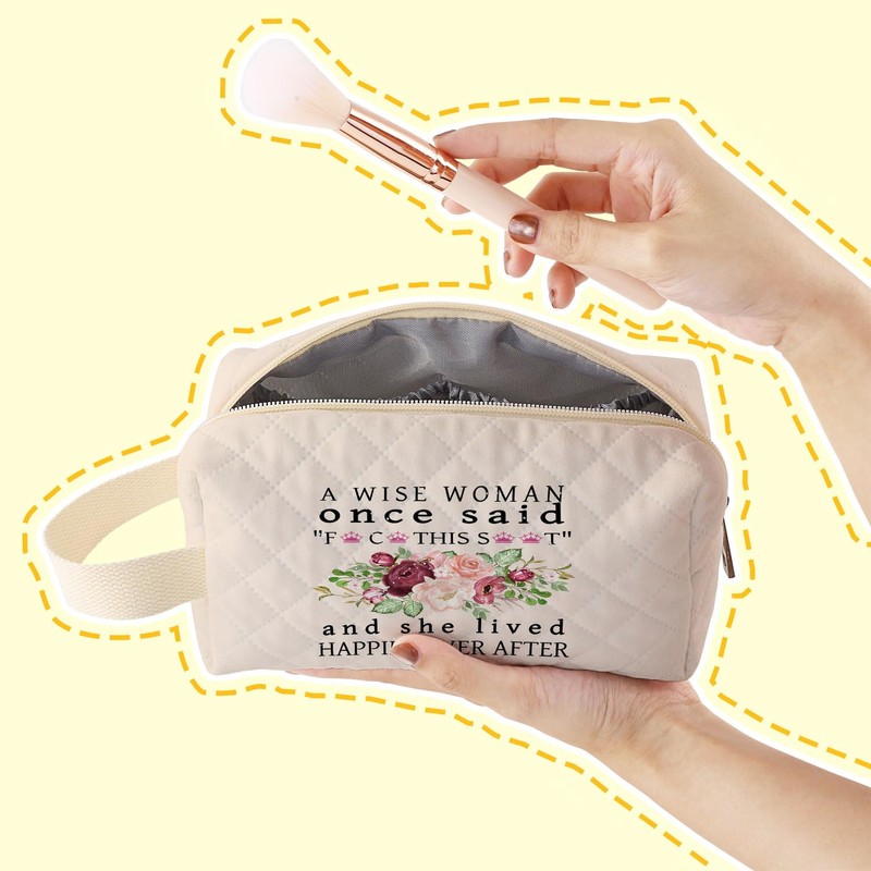 SuoSycorax Funny Text Printed Quilted Makeup Pouch for Women - Velvety Polyester Wise Woman Cosmetic Organizer w/Triple Compartments, Travel & Makeup Brush Holder