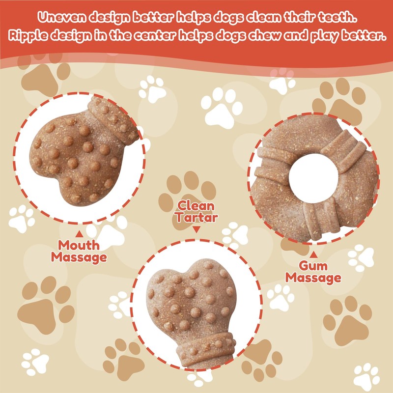 • Teeth cleaning and oral health: Round and smooth edges, raised particles designed to scrape away plaque and tartar during teeth grinding and chewing, promoting healthier gums and fresher breath in dogs