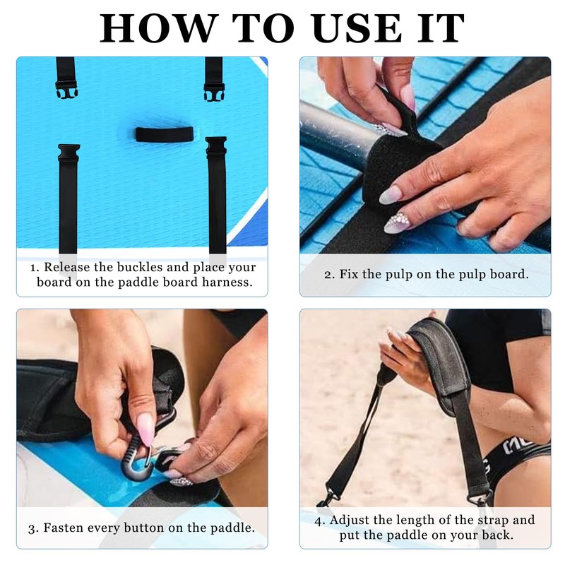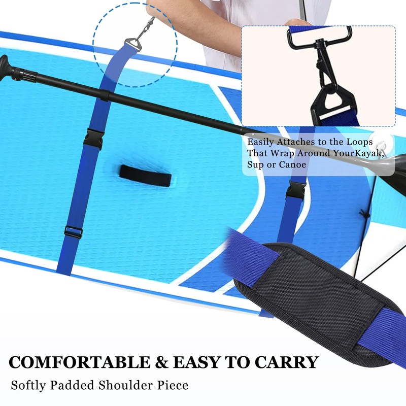 - All-Purpose SUP Carry Strap: Designed for versatility, our paddleboard carrying strap accommodates paddleboards, SUPs, surfboards, longboards, and similar watercraft. The Velcro holders secure your paddle, allowing hands-free carrying. And get 2 additional kayak storage hanger racks.