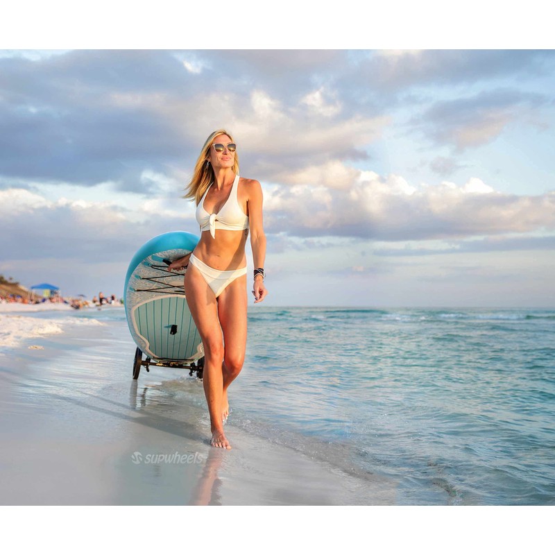 The unit is engineered with a marine-grade aluminum axle, stainless steel fixtures and never-go flat tires. We also enhance your comfort with a unique rubber handle that covers the nylon strap handle. Wheels store on the storage pegs for a small compact package for transporting the wheels or storage. The whole unit can sit on your board while you paddle, and it will float if it goes in the water.
