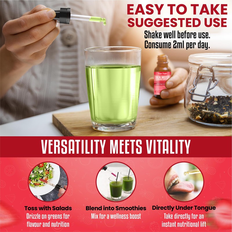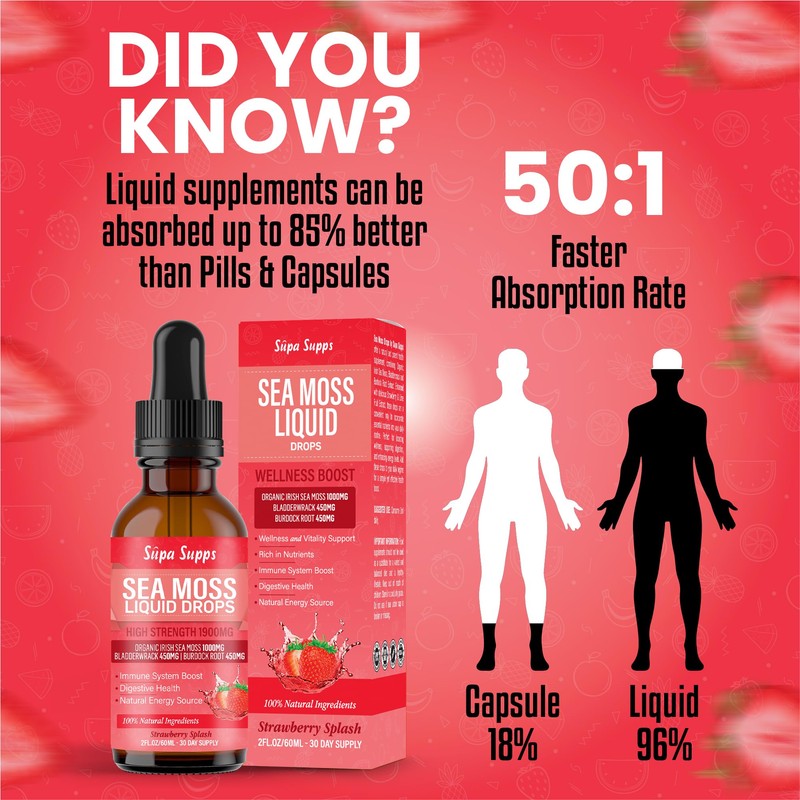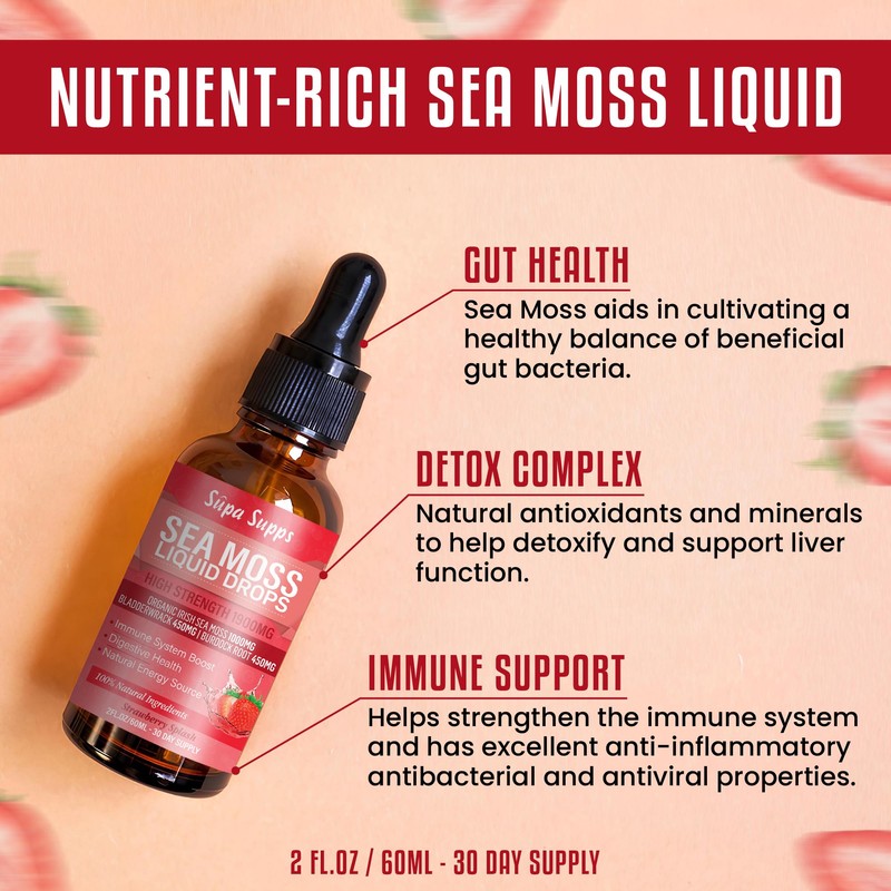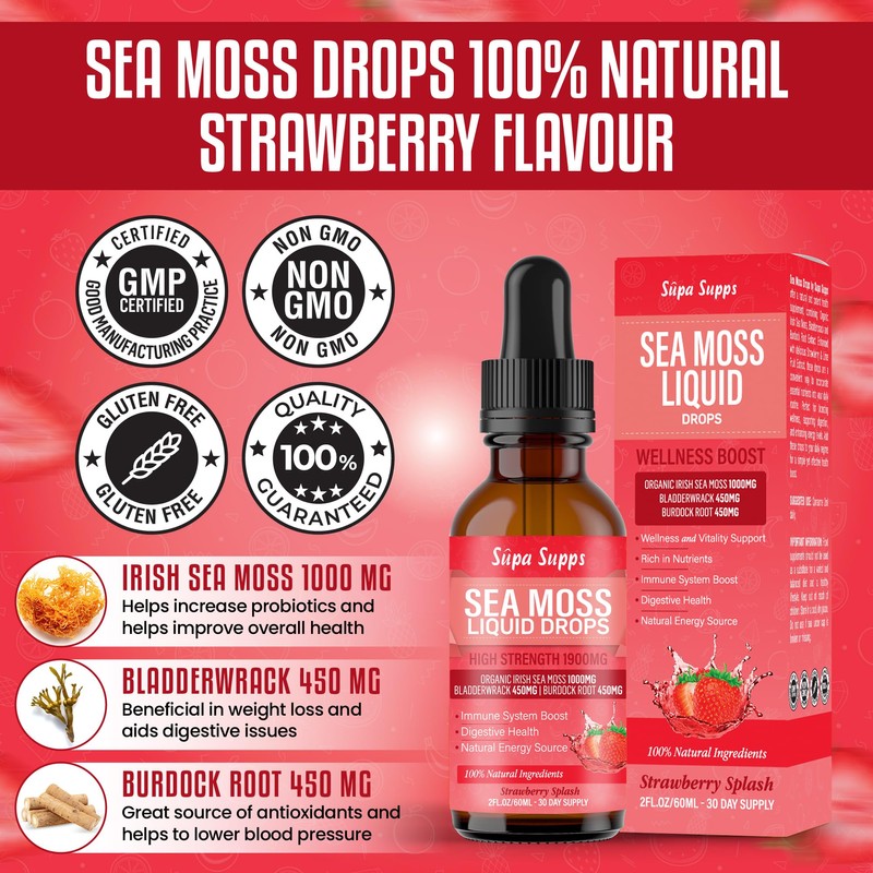 - Premium Irish Sea Moss Gel in Convenient Liquid Form: Our Sea Moss Liquid Drops 60ml provide the benefits of Irish sea moss gel in an easy-to-use liquid. This sea moss supplement is rich in essential nutrients, promoting overall wellness. Made from sea moss organic sources, it's an excellent addition to your daily health regimen.