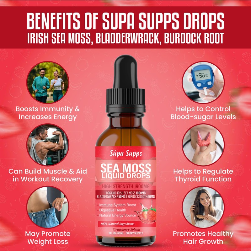 Supa-Supps Organic Sea Moss Liquid Drops 60ml C Irish Sea Moss Organic Supplement for Immune Support, Thyroid Health, Digestion, and Skin, Seamoss Supplements with Bladderwrack & Burdock Root Strawberry Flavour