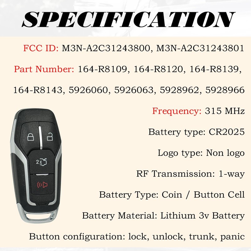 - REPLACEMENT: This Keyless Entry Remote Control Car Key Fob Replacement Is Compatible with Part Numbers: 164-R8109, 164-R8120, 164-R8139, 164-R8143, 5926060, 5926063, 5928962, 5928966.