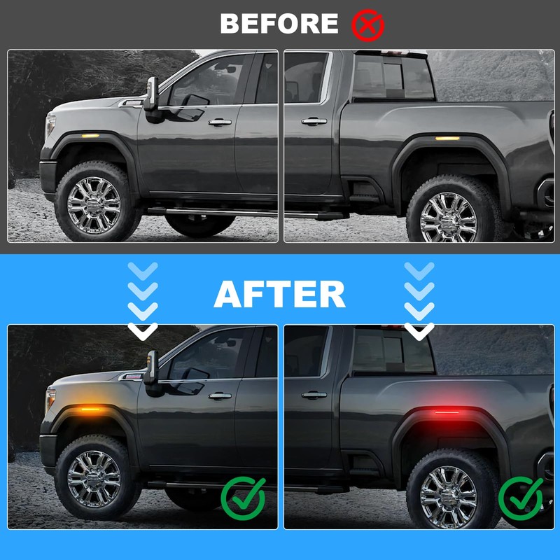 - 【GREAT COMBINATION】Side marker for GMC Sierra uses a combination of amber (front fender) and red (rear fender), which has a more cohesive and eye-catching appearance than the single yellow, white and red luminous combination on the market, so that it can give you better help both in safety and vision!