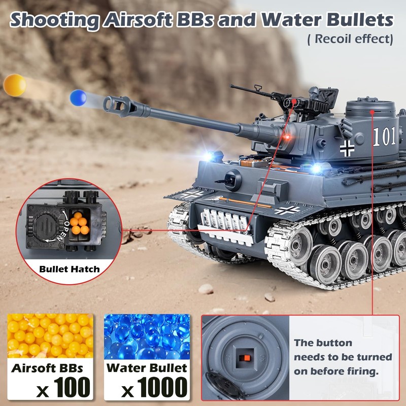 - 【Shooting BBS and Water Bombs】 Remote control tank for adults and kids shoots bbs and water bombs and the burst water bombs pieces will evaporate automatically without cleaning. The bullet hatch and firing switch are both on the top of turret. There is a realistic recoil after each shot.