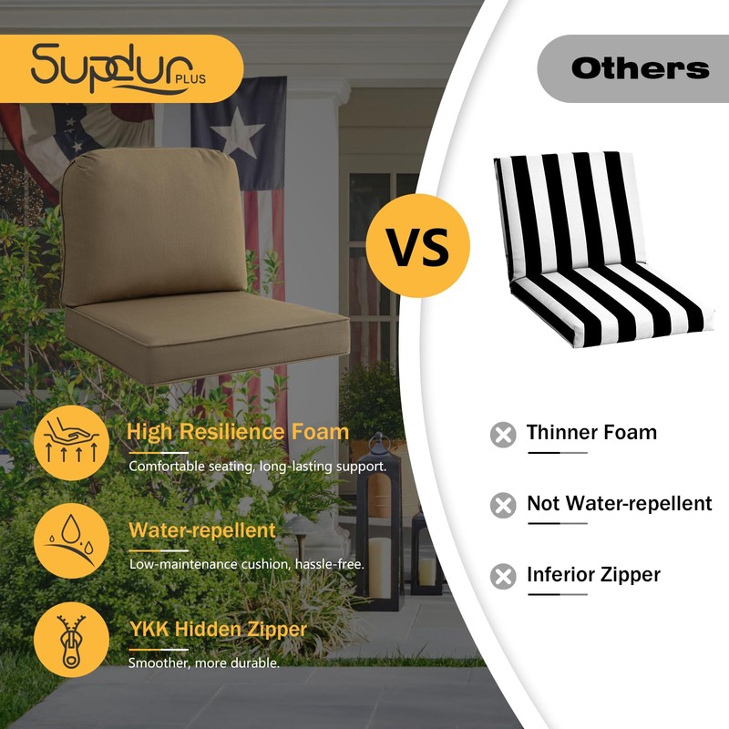 - Classic Design: Revive your outdoor furniture with Supdurplus deep seating cushion sets—high quality, stylish, and designed to fit any space. Our Essential cushions pair classic styles with fresh, on-trend patterns for effortless complement.