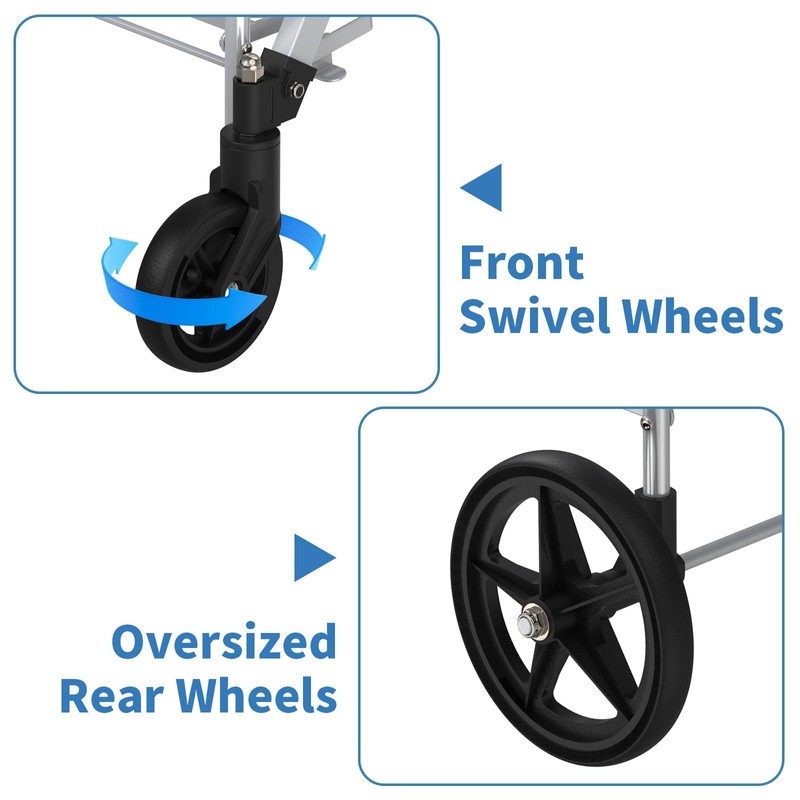 - Experience maximum flexibility and comfort with our upgraded shopping cart. Equipped with two larger swivel front wheels and two oversized rear wheels, you'll have better control and smoother turning, even on sidewalks or muddy roads. The wheels are designed with built-in bearings, reducing friction and ensuring a longer service life
