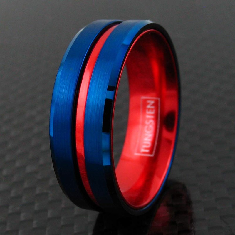 - Super Royal Blue Tungsten Carbide Band Ring w/ Red Anodized Aluminum Inner Band & Matching Red Recessed Stripe.