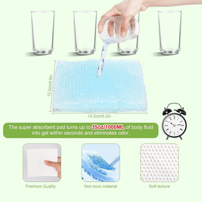 - Highly Absorbent Commode Pads. Each pad measures 4.25in by 5in and turns 35oz/1000ml water into gel within seconds for its core layer contains much more high-quality wood pulp and polymers. Small size but big absorbent capacity, MORE savings