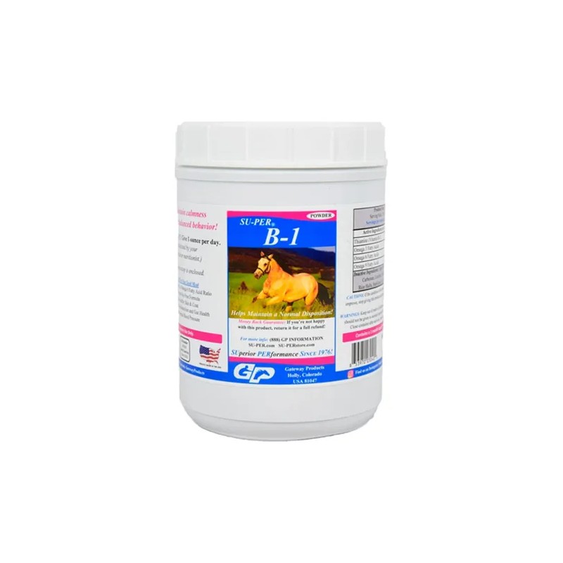 Super B-1 de Su-per es un suplemento en polvo formulado especialmente para caballos que realizan ejercicio intenso. Su ingrediente clave, la vitamina B-1 (tiamina), ayuda al animal a producir energía de forma más eficiente, reduciendo la fatiga muscular causada por el ácido láctico.