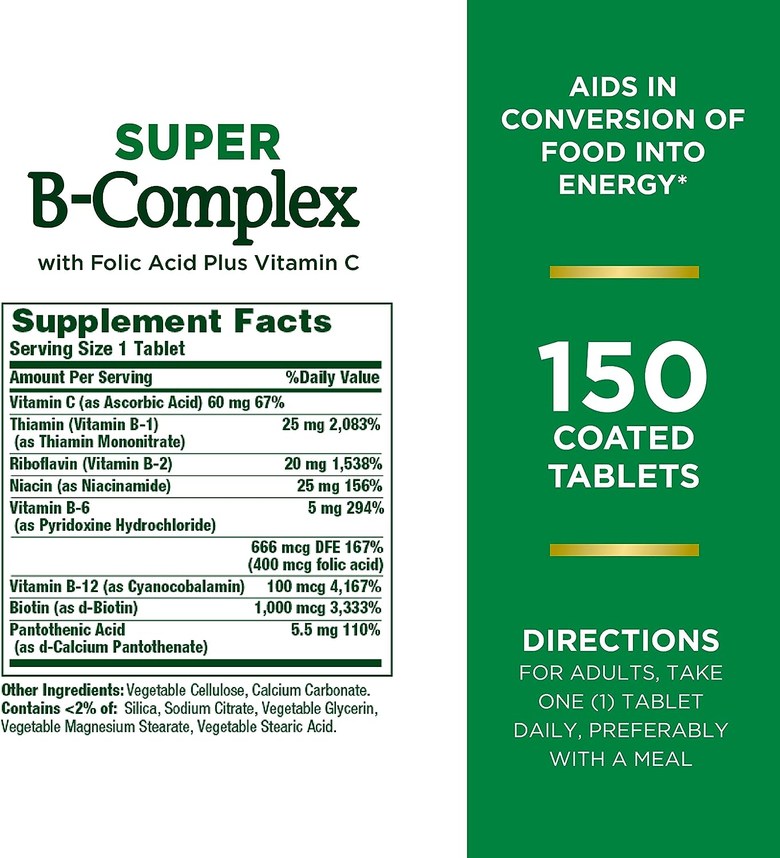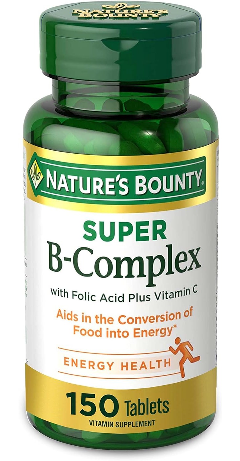 For energy: 150 coated tablets; Nature's bounty of super B complex, which contains folic acid and vitamin C, plays an important role in the body's energy metabolism. Helps the body convert food into fuel that is used to maintain energy.