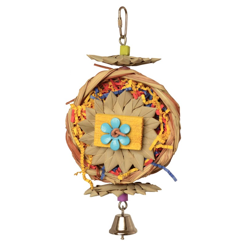 - DESIGN FEATURES – The Beakwhich bird toy is crafted with a fantastic combination of crunchy textures, colors, shapes and materials including a seagrass bowl, woven palm leaf flowers, crinkle shred, pine slat, plastic beads and a liberty bell. Attaches to the cage with a bird-safe pear-link connector.
