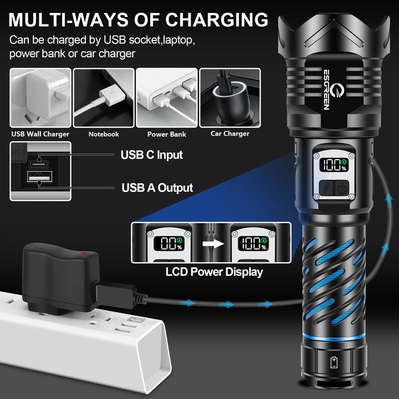 - [2024 UPGRADED HIGH BRIGHTNESS & LONG RANGE LED] The ESGREEN ED0550 rechargeable flashlights high lumens is made of a upgraded PH-L350 50W LED which has a feature of high brightness and ultra long beam. The high powered flashlight provides ultra high brightness, it can easily illuminate the whole room and backyard. The ultra strong beam provides high concentration circle beam, so it can easily and clearly focus on objects up to 5000 feet away. It is ideal for camping, hiking, dog walk, riding etc