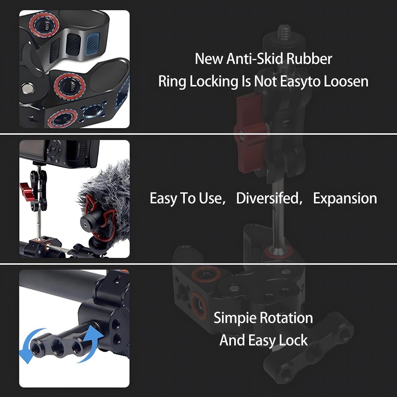 - 【Great Camera Clamp Mount】Made of sturdy Aluminum Alloy and precise CNC process anodized aluminum materials, solid and sturdy, also with a protective dense rubber pad on clamp area to prevent scratches.