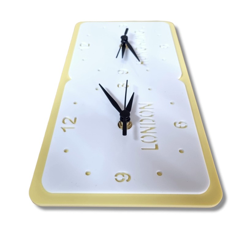 - Made from two colours of acrylic, (a colour behind/frame/numbers and a colour in front)