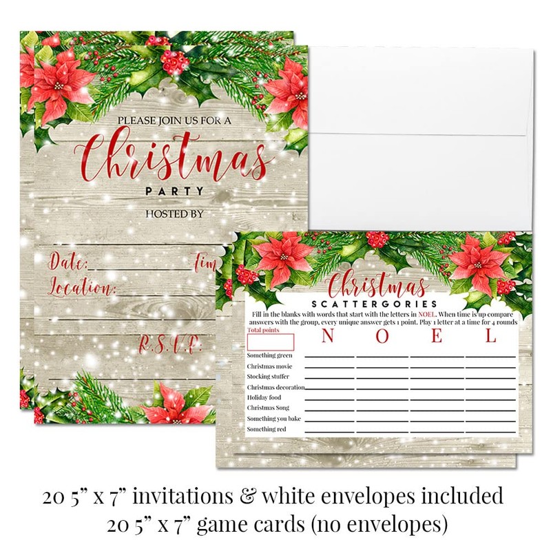 Super Deluxe Watercolor Red Poinsettia Christmas Party Bundle, Includes 20 Fill-In Invitations with Envelopes, 20 Game Cards plus Stickers, Mini Chocolate Candy Bar Wrappers, Water Bottle Labels!