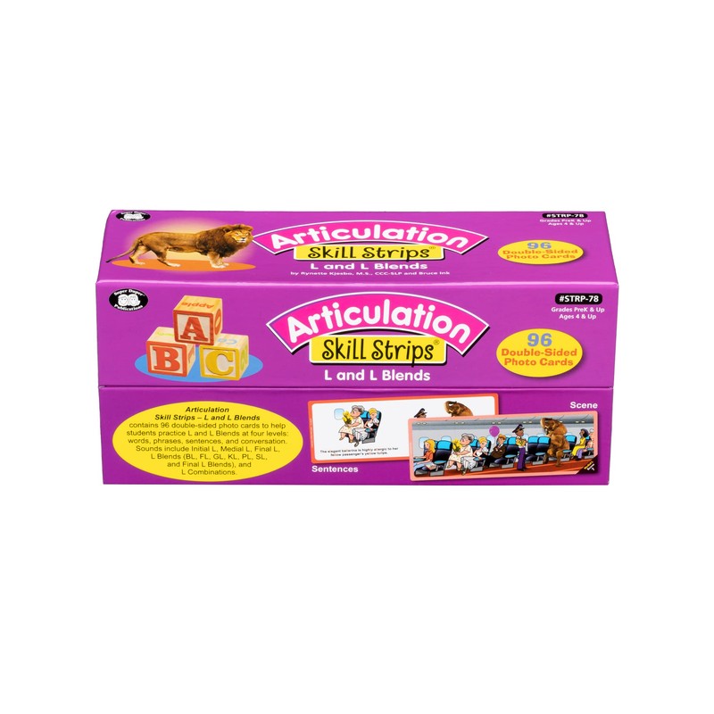 Articulation Skill Strips - L and L Blends contains 96 double-sided photo/illustrated cards to help students practice L and L Blends at four levels: words, phrases, sentences, and conversation. Sounds include Initial L, Medial L, Final L, L Blends (BL, FL, GL, KL, PL, SL, Final L Blends), and L Combinations.