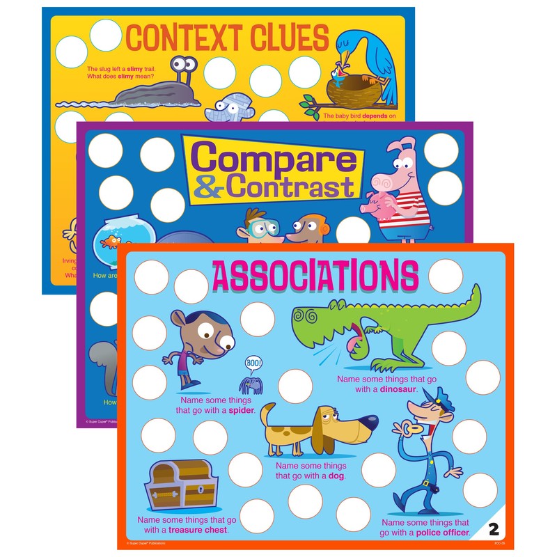 Vocabulary Chipper Chat includes 12 colorful game board designs. With five copies of each - for 60 total boards - parents and teachers can teach the same category with up to five children at a time. There are 360 vocabulary cards with specific prompts and activities, 30 each for 12 different vocabulary skills. Use these motivating game boards and skill prompt cards to address this wide variety of vocabulary and language skills in the classroom with a large or small group, in one-on-one therapy sessions, or at home.