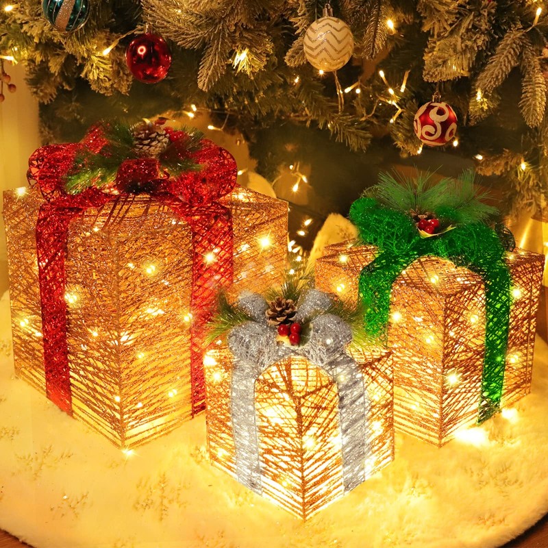 - [ Premium & Glitter Designs ] Premium Material, these Xmas gift boxes are wrapped by golden Glittering yarn, each matched with green, silver, red bows,red berries, pine cones and pine needles. The golden Glittering yarn of surface make it shiny and sparkling. When the light passes through the box, it will be reflected on the surface, provides a beautiful glowing lights. Made of PVC material, constructed by stable metal frame, durable and reusable.