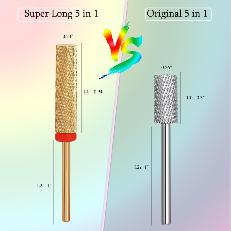 - Super Long Design (5 in 1 Option): Effortlessly reaches hard-to-access areas around cuticles and under nails for thorough cleaning and shaping, minimizing hand fatigue (5-in-1 bits offer versatile sizing in one)