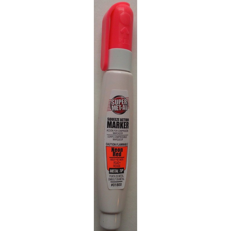 Super Met-Al Neon Red 1800 Industrial Marker Metal Tip Brand: Super Met-Al Markers Purchase is for one Met-Al marker. THE FABRICATORS CHOICE! Mark on Metal, Stone, Glass, Rubber, Plastic, Wood, Leather and virtually any other hard to mark surfaces! Including Oily Surfaces This is a handy tool for any machine shop, auto workshop, plumber, welder, marble and granite fabricator, trade craftsman, tool shop, vacuum line/electrical line coding, etc. Opaque paint. Quick Dry! The Clip design makes the markers convenient to carry in your vest pocket. Marked surface can be completely cleaned with paint thinner. MADE IN USA SUPER MET-AL SQUEEZE ACTION METAL TIP INDUSTRIAL USE MARKERS Metal Tip These markers contain glue-based paint that is permanent, dries quickly, and is water, weather, and fade resistant. Fine metal tip enables writing on difficult surfaces. The marking range is -50 degrees Fahrenheit to 150 degrees Fahrenheit. The stainless steel, spring loaded, metal tip makes thin, defined marks and lines and works by gently squeezing the body of the tube and pressing the tip onto the surface of what you wish to mark. This is a handy tool for use in welding shops, auto repair shops, auto salvage yards, machine shops, tool shops, quality control making/coding, electrical coding, etc. Package Quantity: 1 From bulk pack Red Neon: MPN: 1296-1800 UPC: 077223050082