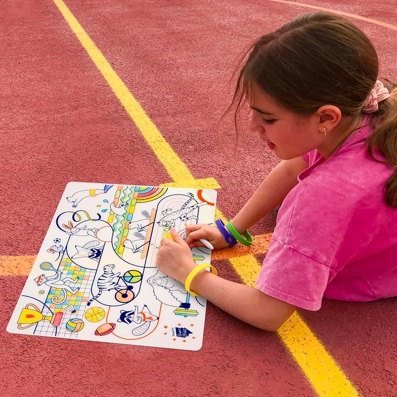 SUPER PETIT - Tischset zum Ausmalen – Sport – 5 Filzstifte und Armband im Lieferumfang enthalten – leicht zu reinigen – wiederverwendbar – antibakteriell – ab 3 Jahren