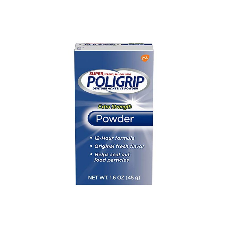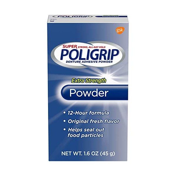 hold of Super PoliGrip Extra Strength Powder. Helps hold dentures tight for up