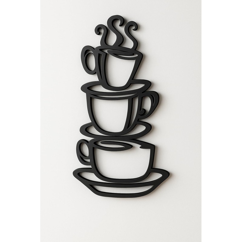 - Welcome guests with a warm and playful look that accents any interior design color scheme like neutral tones to vibrant paints and stains. Cut out shape design with silhouette of stacked coffee cups on tea plates with steam arising from the peak. Perfect for any coffee lover! A simple yet creative approach to a coffee decor wall art that perfect for a home kitchen, restaurant, coffee shop, cafe or diner.