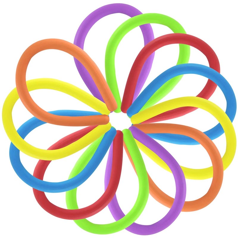 - Each thick jelly string noodle measures 10" inches and can stretch to over 5 feet long. Comes in a total of 24 rubber noodle toys, in assorted colors.