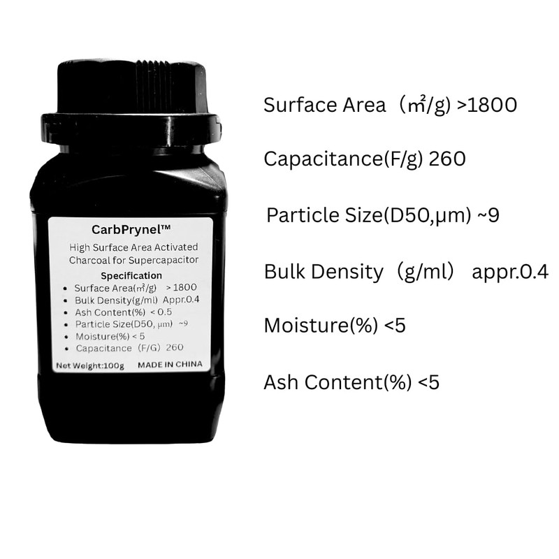 Supercapacitor Activated Carbon Powder 100g – >1800 m²/g Surface Area, 260 F/g Capacitance, D50~9μm, Low Moisture & Ash Content