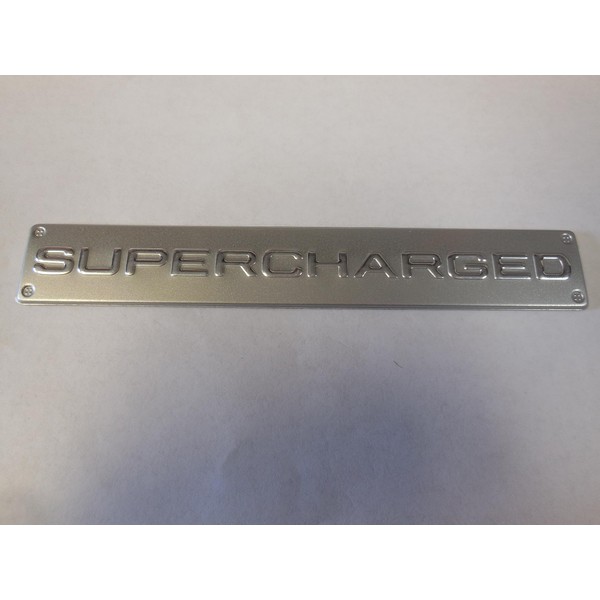 Beautiful looking high qualitry ABS platic SIPERCHARGED emblem with self stiick backing. It measures 6 1/2" long and 1" tall. It features 4 simulated fastners, one at each corner. It has a bright silver background with chrome like lettering