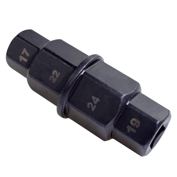 - 【Feature】You can use this tool as a screwdriver handle, by connecting a half inch drive extension with a socket and turn it with a wrench. This tool offers correct size and provides a snug fit, but not too tight. Four metric hex sizes included: 17mm, 19mm, 22mm, 24mm. The 19mm side can be used with a 3/8" drive ratchet or an an open end wrench, and the 17mm side can be used only with an open end wrench.