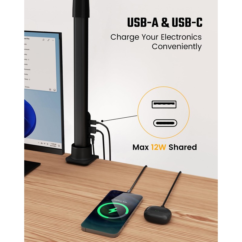 - 2 BUILT-IN USB PORTS: The lamp's base includes a USB-A and a USB-C port, allowing you to charge your phone and other devices like earbuds or smartwatches directly. This design helps keep your workspace tidy and makes charging easier, whether you're working or reading.