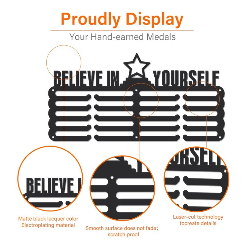 - Sports Medal Holder: This medal Hanger display is designed in inspirational theme with lettering “Believe in yourself” and star decorations, in 5x4 rows, totally 20 hanging rows, for athlete medal and ribbon hanging displaying.
