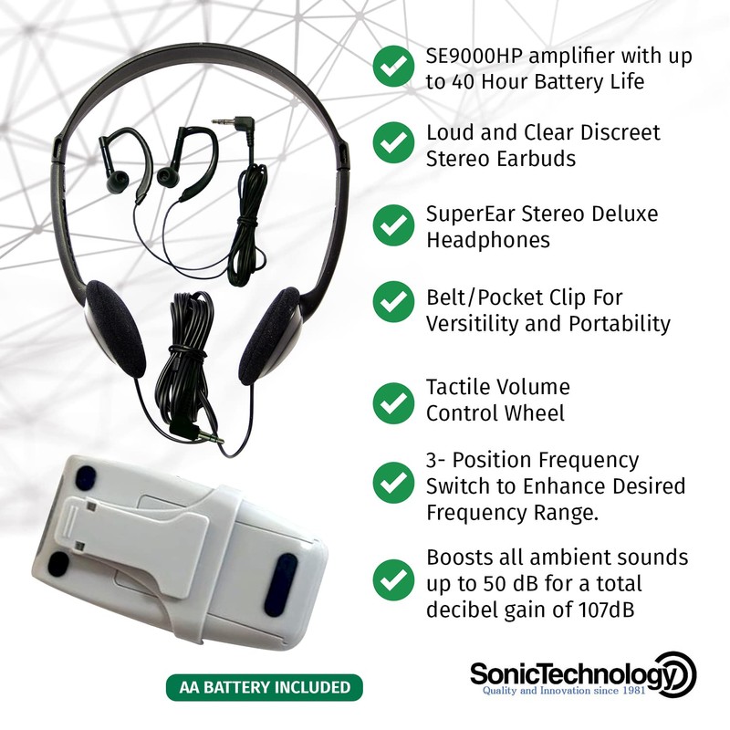 SuperEar Rechargeable Personal Sound Amplification Product Model SE9000HP Complete System with Headphones and Earbud Increases Sound 50dB, 3 Tone Frequency Selection